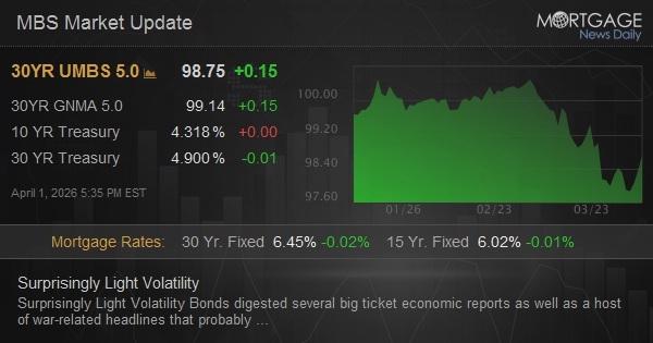 Bonds digested several big ticket economic reports as well as a host of war-related headlines that probably would have caused a much bigger reaction a few weeks ago. But the net effect was an almost perfectly flat day by the 3pm CME close. If anything, the data caused some weakness and we can say bonds would have rallied more noticeably otherwise. The weak response is no surprise considering all 3 reports were stronger than expected. This also serves as a reminder that Friday's jobs report is still a relevant market mover despite a general focus on the war and energy prices.