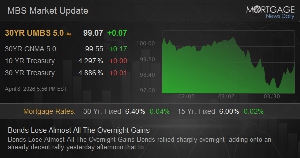 Bonds rallied sharply overnight--adding onto an already decent rally yesterday afternoon that took 10yr yields from 4.38% to 4.23% in less than 24 hours. Now at Wednesday's close, we're back to unchanged levels near 4.30%. The move follows a similar correction seen in longer-term oil futures and, in a general sense, a news cycle that made the ceasefire seem increasingly tenuous as the day progressed. The absence of a bigger, sustained rally speaks to the uncertainty surrounding the U.S. withdrawal from the Middle East as well as lingering impacts on energy costs that may still flow through to inflation data.