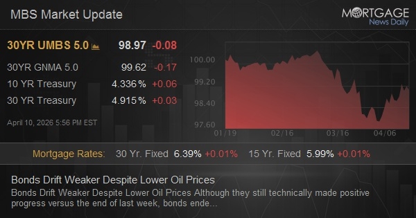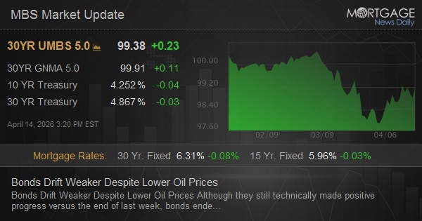 Although they still technically made positive progress versus the end of last week, bonds ended the day moderately weaker. Lower oil prices offered no support, but that's a tricky correlation these days. Longer-term oil contracts continue lining up with bond yield movement more reliably. To be sure, we can at least consider the impact of this morning's CPI data based on decent trading volume at the time and a reversal of the sideways to slightly stronger momentum in the preceding few hours, but it's impossible to say that it continued weighing on bonds for the rest of the session.