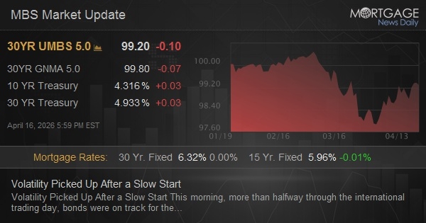 This morning, more than halfway through the international trading day, bonds were on track for the narrowest trading range since February 24th. The low volatility didn't last. Sellers surfaced in response to several war-related headlines. Bond yields followed oil prices higher from 9am through 1pm ET. That said, it was still a fairly light day of movement in bonds with MBS only losing about an eighth of a point depending on when you look and 10yr yields up 3bps at 4.31+ in the final hour of trading.