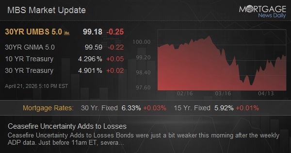 Bonds were just a bit weaker this morning after the weekly ADP data. Just before 11am ET, several newswires called ceasefire negotiations into question. Chief among these was a report that Iran had not confirmed its intent to participate. Despite the seemingly significant consequences, bonds only rose about 2bps in terms of 10yr yields. By the 3pm CME close, yields were up less than 4bps on the day and still well inside the prevailing consolidation range. There's been a bit more weakness since then owing to new headlines indicating that neither Iran nor JD Vance are attending Wednesday's planned talks in Pakistan.