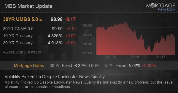 It's not exactly a new problem, but the issue of incorrect or misconstrued headlines is growing larger as the Iran war persists. It makes sense considering the current lull in both military and diplomatic developments. People who write and profit from breaking newswires are eager to cash in on clicks and dollars. Around 1pm ET today, several newswires created obvious volatility for bonds/oil/stocks. These involved an apparent resignation of a key Iranian official from the negotiations team and the implication that Tehran's activated air defenses meant a breach of the ceasefire. Both were refuted. Markets corrected slightly, but a certain amount of damage was done (also, markets may not believe the refutations). The net impact on bonds remained small with 10s only up a few bps and MBS down just over an eighth of a point.