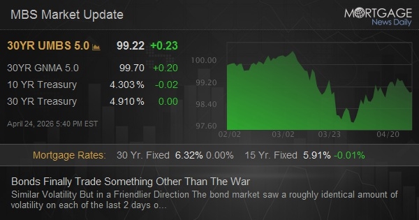 The bond market saw a roughly identical amount of volatility on each of the last 2 days of the week, but Friday's version played out in a friendlier direction. Headlines suggested improved prospects of peace negotiations over the weekend. While there is no scheduled talk with the US and Iran, high level reps from both sides are currently--or soon will be--in Pakistan. But the war headlines only get part of the credit. Bonds also got a boost from news that the DOJ dropped its case against Powell, thus paving the way for a Warsh confirmation. In the market's view, this improves the odds of a rate cut in 2026, even if only slightly. 2yr yields rallied much more than 10s, as one would expect when markets are trading Fed rate expectations.