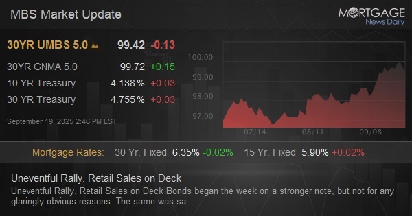 Flat overnight with early, modest gains. MBS up 3 ticks (.09) and 10yr down 2.3bps at 4.043