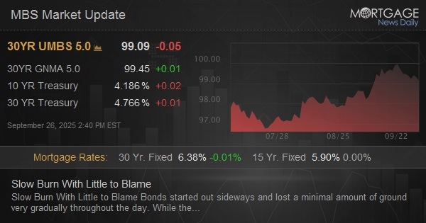 Bonds started out sideways and lost a minimal amount of ground very gradually throughout the day. While there were multiple Fed speakers on tap, none of the comments garnered any clear reaction. In terms of timing, the losses only really line up with the start of the 9:30am NYSE open--something that can sometimes create tradeflow dynamics that impact bonds--especially when we're only talking about the sort of modest move seen today.