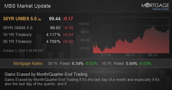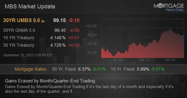 If it's the last day of a month and especially if it's also the last day of the quarter, and if bonds are making a move in the second half of the day for no other apparent reason, the default scapegoat is month/quarter-end positioning. Month-end trading can take a variety of forms ranging from broad asset-allocation trades between stocks and bonds to specific buying/selling of Treasuries to achieve various portfolio goals. This can be as simple as certain accounts no longer needing to hold as many Treasuries after the 3pm marking period. Either way, the selling wasn't extreme, by any means, but it was enough to erase the gains facilitated by this morning's weaker econ data.