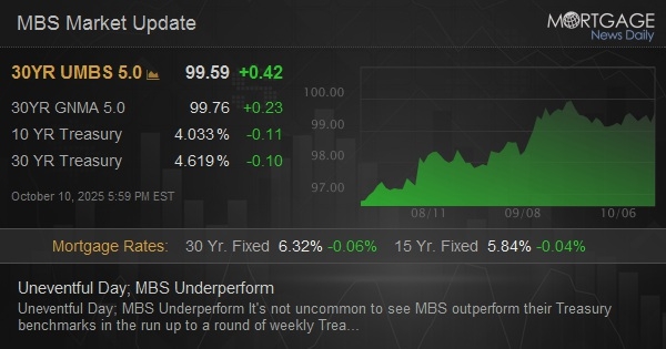 It's not uncommon to see MBS outperform their Treasury benchmarks in the run up to a round of weekly Treasury auctions only to underperform when the auction cycle wraps up. That underperformance (or rather, Treasury outperformance) was on full display today with MBS losing about a quarter point while 5yr notes lost about half as much. While bonds are slightly closer to the weaker end of the recent range, they're still very much inside it.