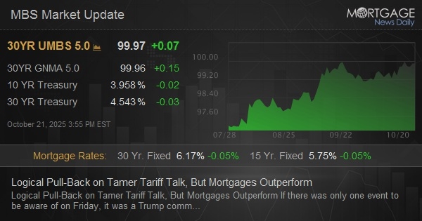 If there was only one event to be aware of on Friday, it was a Trump comment around 7:10am ET in which The President said that the recently-announced 100% tariff on China was probably not sustainable. Stocks, bond yields, and volumes spiked instantly and nothing much happened for the rest of the day. Fortunately for the bigger picture, Thursday's mid-day drama caused a big enough bond rally that Friday's pull-back only managed to erode about half the gains. The news is even better for mortgage rates. Lenders had a big enough cushion from Thursday's volatility that Friday's pull-back merely resulted in rates holding steady on average. That means the average lender is fairly close to September's lows which are close enough to the lowest rates in 3+ years.