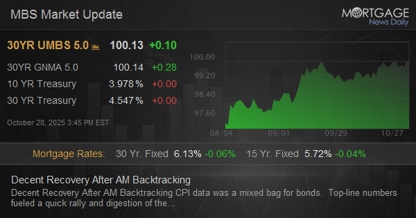 CPI data was a mixed bag for bonds. Top-line numbers fueled a quick rally and digestion of the details brought us back to negative territory (albeit with help from stronger S&P PMI data). Bonds found their footing shortly after 10am at just slightly stronger levels and then stayed mostly sideways through the close. Pretty ho-hum CPI day given all the anticipation...