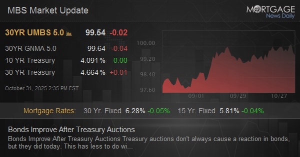 Stronger both before and after 5yr Treasury auction. MBS up 1 tick (.03) and 10yr down 2bps at 3.999