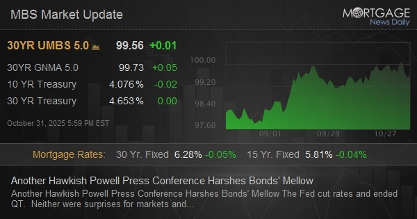 The Fed cut rates and ended QT. Neither were surprises for markets and neither had an impact. The press conference was hawkish, however, with Powell saying a December cut was far from a foregone conclusion. This is very much counter to the market's expectation that a December cut was a lock. Fed Funds Futures tanked and yields surged about 8bps in the 10yr. MBS lost about 3/8ths and negative reprices continue to roll in.