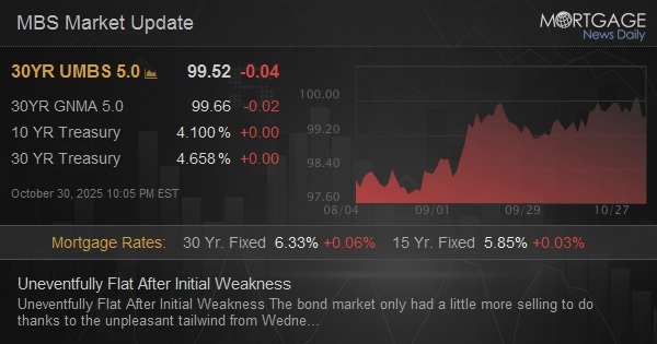 10yr yields are still off the morning highs, but up 2.3bps at 4.095. MBS down 2 ticks (.06) on the day and 6 ticks (.19) from the highs.
