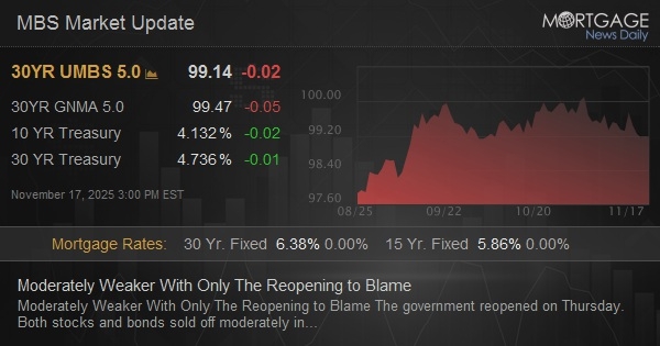 The government reopened on Thursday. Both stocks and bonds sold off moderately in response. The bond market weakness is in line with our expectations for a confirmed reopening based on the simple logic that a prolonged shutdown would have been increasingly detrimental to economic growth. Comments from a few Fed speakers added fuel to the fire by calling a December rate cut into question. That said, assuming the big-ticket econ data is back up and running by then, the outcome of those reports will likely add clarity to rate cut expectations (or lack thereof). In case anyone needs the reminder, econ data WILL NOT simply resume on its previous calendar. Releases that were on the schedule will be delayed until further notice and we continue waiting for an updated release schedule from data agencies.