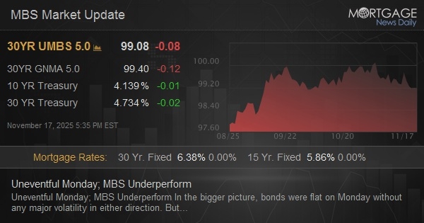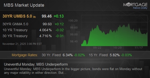 In the bigger picture, bonds were flat on Monday without any major volatility in either direction. But if we break out the microscope, we find longer-term Treasuries rallying modestly while MBS lost 1 tick by the 3pm close. In today's case, the MBS underperformance is most easily attributed to Treasuries' underperformance on Friday. Specifically, 10yr yields pressed up to new highs by the end of the day whereas MBS held just slightly above their mid-day lows. Said another way, if we look back 2 trading sessions instead of 1, there's no noticeable underperformance. The flat vibes are consistent with an absence of actionable info. This will change as the week continues, especially on Wednesday (Fed Minutes) and Thursday (NFP).
