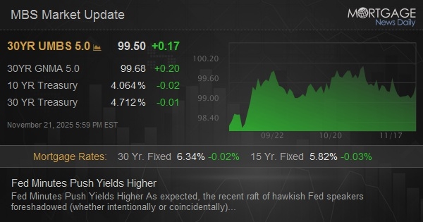 As expected, the recent raft of hawkish Fed speakers foreshadowed (whether intentionally or coincidentally) a hawkish message in today's Fed minutes. At issue: "many" meeting participants felt that a December cut would NOT likely be justified as opposed to "several" who disagreed. This was compounded by the fact that BLS rescheduled the early December jobs report for 12/16/25--6 days after the December Fed meeting. In other words, there won't be any employment data that would help the Fed justify a cut next month. Fed Funds futures agreed with a spike in implied yields immediately following the BLS news. Longer-term bonds followed suit after the Fed Minutes.