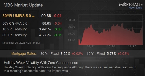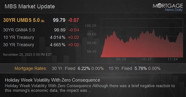 Although there was a brief negative reaction to this morning's economic data, the impact was minimal. Random holiday-week volatility accounted for bigger swings, but those swings ultimately canceled each other out. By the 3pm close, bonds were close enough to unchanged levels. That makes today truly forgettable in the bigger picture. Trading doesn't get real/serious again until December. NOTE: Friday is technically open until 2pm ET, but as is our custom, we will only publish commentary on an "as-needed" basis (i.e. if the movement is minimal, you won't hear from us until Monday).