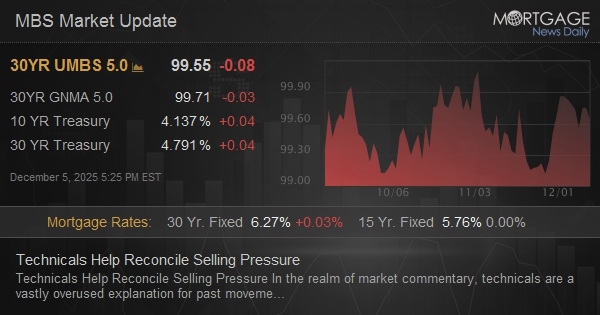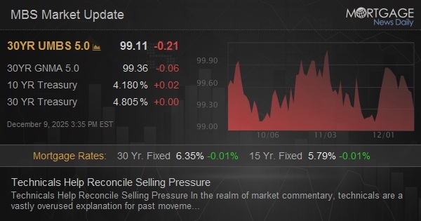 10yr yields are up 3bps at 4.128. MBS are down only 3 ticks (.09) on the day.