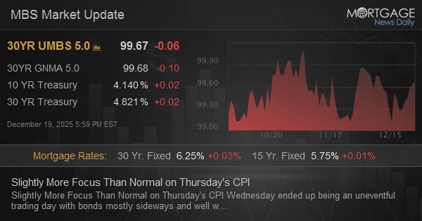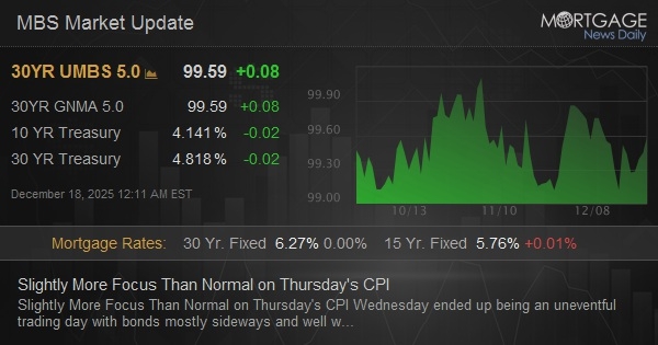 Wednesday ended up being an uneventful trading day with bonds mostly sideways and well within the recent trading range. This isn't hard to believe given the absence of any relevant market movers. Thursday could be different thanks to the Consumer Price Index (CPI). This is one of those reports that has occasionally swung for the fences, but that can also have almost no impact. The present example could receive a bit more focus than normal as it will be the first time we've seen this data since October 24th. In addition, recent Fed speeches have reintroduced inflation concerns as a reason to be patient when it comes to additional rate cuts. None of this guarantees fireworks, but at the very least, it's the last potential source of fireworks this year as far as econ data is concerned.