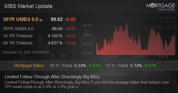 If you told the average trader that today's core CPI would come in at 2.6% vs 3.0% year over year, they would have expected a much bigger reaction than we saw today. Ironically, the size of the miss may be one of those reasons. It's so far outside the realm of expected possibilities that traders immediately assumed the presence of legitimate issues with November's data collection. Nonetheless, it was worth a moderate extension of the overnight rally.