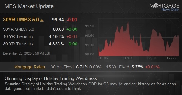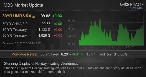 GDP for Q3 may be ancient history as far as econ data goes, but markets didn't seem to think so in the hour following this morning's release. GDP was much stronger than expected and bonds traded it like it was a legit market mover. But most of the reaction was a holiday-induced amplification of what might have otherwise only caused barely-noticeable weakness in bonds. That point was driven home by the end of the day as both Treasuries and MBS returned to unchanged levels.
