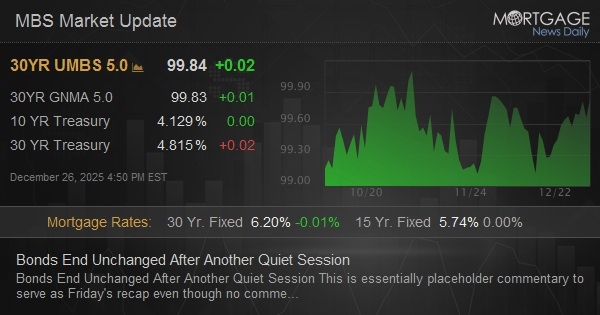 modestly stronger overnight and sideways so far. MBS up 3 ticks (.09) and 10yr down 1.2bps at 4.12