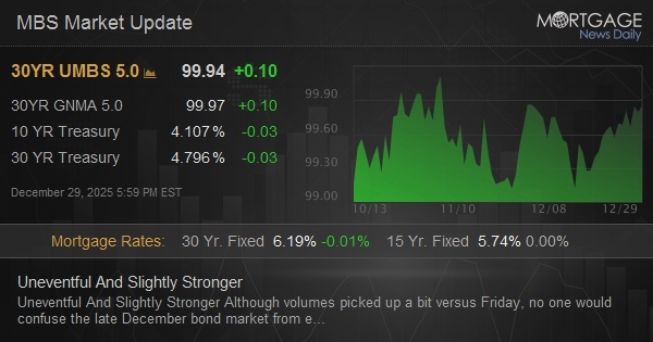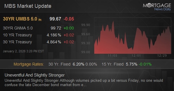 Modestly stronger overnight and holding sideways so far. MBS up 2 ticks (.06) and 10yr down 1.6bps at 4.117