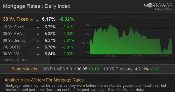 Mortgage rates may not be as low as they were before the weekend's geopolitical headlines, but they've moved just a hair lower on each of the past two days. Specifically, our daily rate index is down to 6.19% after starting the week at 6.21% on Tuesday (up from 6.07% last Friday).
