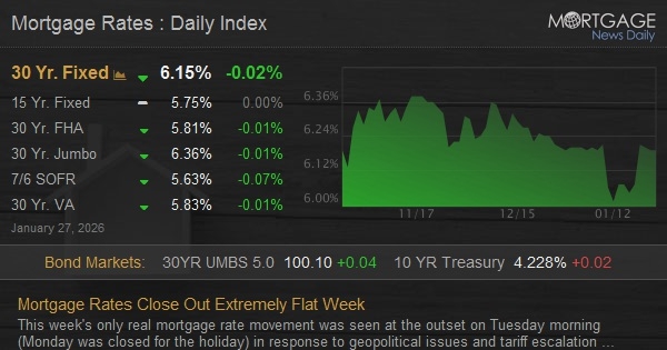 This week's only real mortgage rate movement was seen at the outset on Tuesday morning (Monday was closed for the holiday) in response to geopolitical issues and tariff escalation potential. Rates recovered only modestly when those threats abated--a fact that had everything to do with the bond market refusing to return to last week's levels and nothing to do with any mortgage-specific issue.