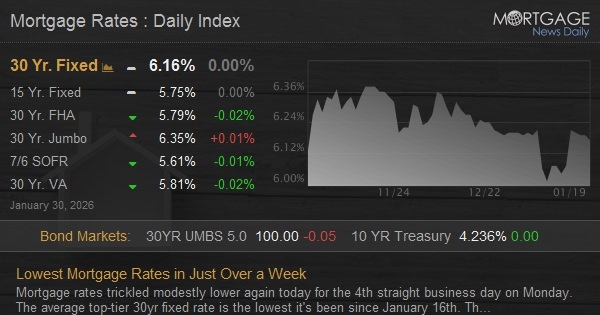 The only catch is that it was quite a bit lower 2 weeks ago. Compared to today's mark of 6.17% on MND's daily rate index, mid-January lows ranged from 5.99 to 6.07%. Note: in the following chart, 6.01 is the lowest mark, but in intraday terms, January 9th saw 5.99 for the better part of the day.