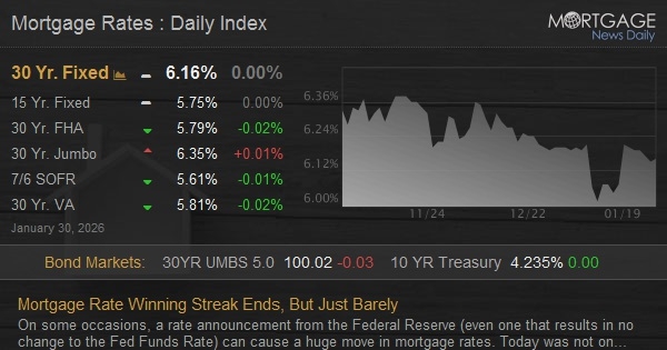 Financial markets agreed. There was essentially no reaction to any of today's Fed events in stocks or bonds. Flat bonds = flat mortgage rates all else equal. Today's average rate was microscopically higher than yesterday's, but that happened well before the Fed announcement and not for any specific reasons.