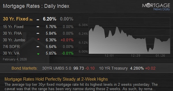 The average top tier 30yr fixed mortgage rate hit its highest levels in 2 weeks yesterday. The caveat was that the range has been very narrow during these 2 weeks. As such, by remaining unchanged versus yesterday, today's rates are part of the same narrow range (6.15-6.20% for MND's index).