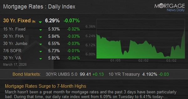 March hasn't been a great month for mortgage rates and the past 3 days have been particularly bad. During that time, our daily rate index went from 6.09% on Tuesday to 6.41% today--the highest since September 4th, 2025. While that's certainly not the fastest jump we've seen, it's the worst 3-day stretch since early April, 2025.
