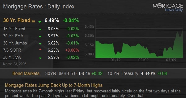 Mortgage rates hit 7-month highs last Friday, but recovered fairly nicely on the first two days of the present week. The past 2 days have been a bit rough, unfortunately. Over that time, the average top-tier 30yr fixed rate rose 0.14% to 6.43%--just a bit higher than last Friday's 6.41%.