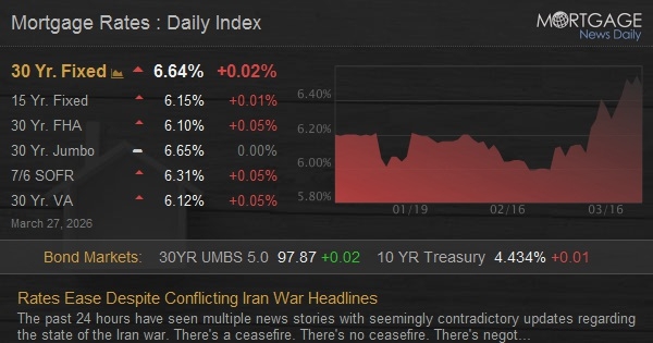 Bond yields (which correlate with mortgage rates) have been doing even better than oil prices today. The net effect is the lowest average mortgage rates since last Thursday. Notably, these rates are still sharply higher than February's and, apart from the past few days, the highest since early September, 2025.