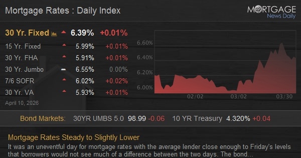 It was an uneventful day for mortgage rates with the average lender close enough to Friday's levels that borrowers would not see much of a difference between the two days. The bond market (which underlies and dictates rate movement) was still in quasi-holiday mode as most overseas markets were closed for holidays.
