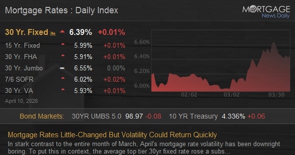 In stark contrast to the entire month of March, April's mortgage rate volatility has been downright boring. To put this in context, the average top tier 30yr fixed rate rose a substantial 0.65% by March 27th. In the first five business days of April, they've held inside a range of just 0.04%.
