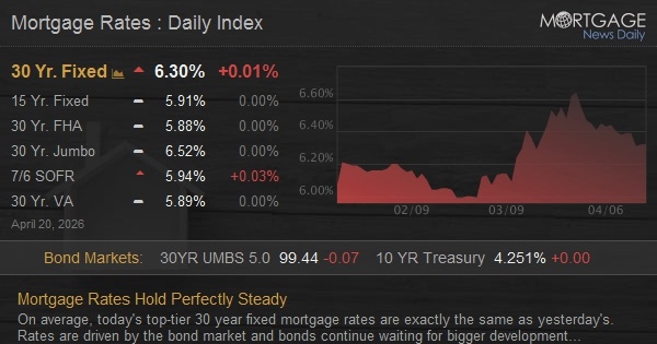 On average, today's top-tier 30 year fixed mortgage rates are exactly the same as yesterday's. Rates are driven by the bond market and bonds continue waiting for bigger developments in the Iran war. At the moment, the market is in a sort of limbo as time remains on the 2-week ceasefire.
