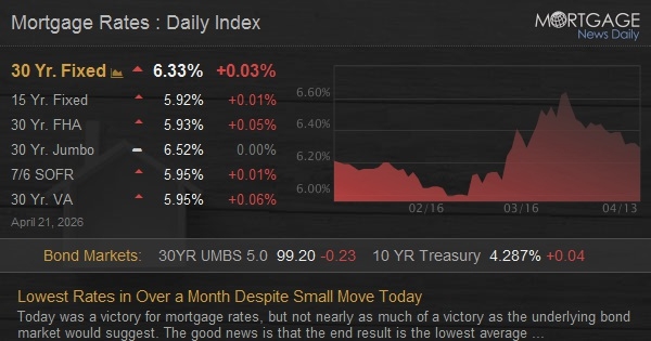 Today was a victory for mortgage rates, but not nearly as much of a victory as the underlying bond market would suggest. The good news is that the end result is the lowest average 30yr fixed rate in just over a month.