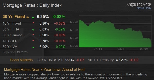 The overall set-up is reminiscent of September 2024 when rates were doing the same thing for the same reasons ahead of Fed meeting with a virtual 100% chance of a rate cut. Back then, mortgage rates moved paradoxically higher after the Fed rate cut. The same thing could happen this time, but it's by no means guaranteed.