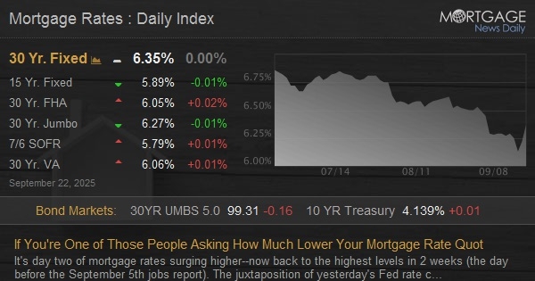 There are an unfortunate number of news articles out there today that claim mortgage rates are LOWER. This is due to Freddie Mac's weekly rate survey dropping to 6.26 from 6.35 last week. Freddie's rate is an average of the 5 days ending yesterday, so 80% of the input is comprised of the lowest rates in a long time. News organizations then quote the survey and give the impression that this week's rates are lower than last week's.