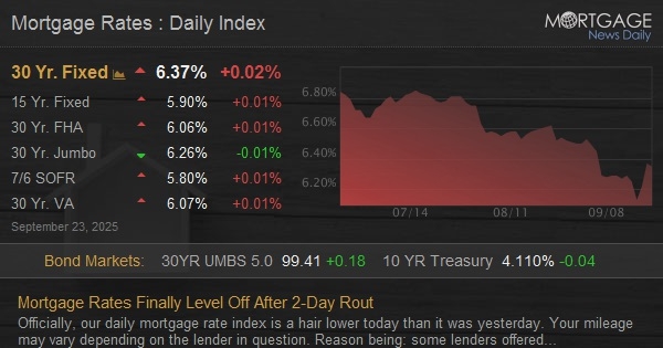 Officially, our daily mortgage rate index is a hair lower today than it was yesterday. Your mileage may vary depending on the lender in question. Reason being: some lenders offered mid-day improvements yesterday, but not enough to impact our index. Those same lenders are generally a hair higher today, but again, the average lender is a hair lower.