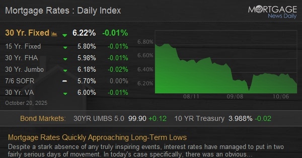 As conventional 30yr fixed rates move down from the 6.3's toward the 6.1's, this is a zone that can see larger than normal movement for reasons laid out back in early September (A Quick Note on Why Rates Seem to Drop More Quickly as They Approach Certain Thresholds).