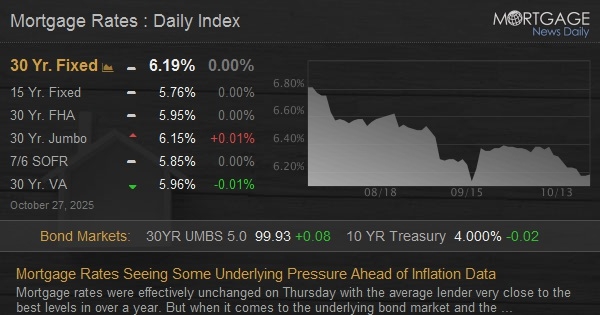 Mortgage rates were effectively unchanged on Thursday with the average lender very close to the best levels in over a year. But when it comes to the underlying bond market and the rates available to consumers, there are some dislocations that suggest risk is increasing.