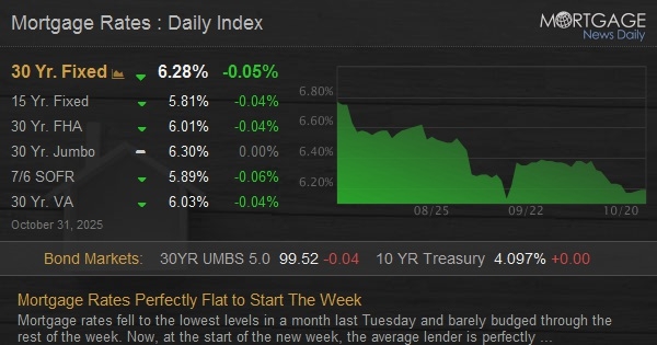Mortgage rates fell to the lowest levels in a month last Tuesday and barely budged through the rest of the week. Now, at the start of the new week, the average lender is perfectly unchanged from last Friday. This means there are only a small handful of days with meaningfully lower rates going all the way back to late 2022.