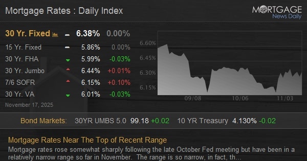 Mortgage rates rose somewhat sharply following the late October Fed meeting but have been in a relatively narrow range so far in November. The range is so narrow, in fact, that yesterday's average rate was at the bottom of that range while today's rate is closer to the highs.