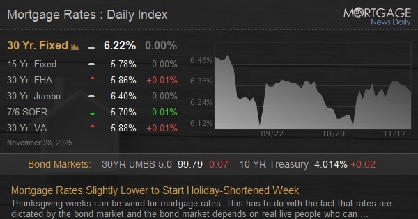 Thanksgiving weeks can be weird for mortgage rates. This has to do with the fact that rates are dictated by the bond market and the bond market depends on real live people who can actually be out of the office on holiday weeks. The lighter levels of participation can increase volatility and cause random movement for no apparent reason.
