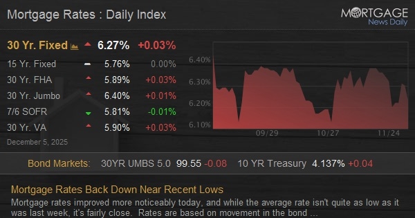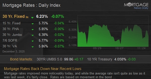 Mortgage rates improved more noticeably today, and while the average rate isn't quite as low as it was last week, it's fairly close.