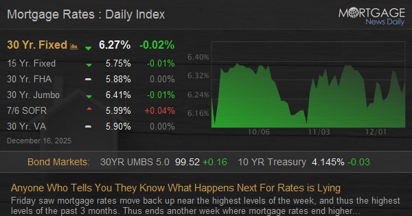 In contrast, the upcoming week actually has significant new market movers. These include Retail Sales for October, CPI inflation data for November, and the much-anticipated November jobs report (as well as half of the October jobs report). Unlike the Fed rate cut, markets can't accurately predict how these reports will come out. If they're mostly stronger than expected, rates will break up and out of their recent range. If the reports are weaker, rates should retreat back down into that same range.