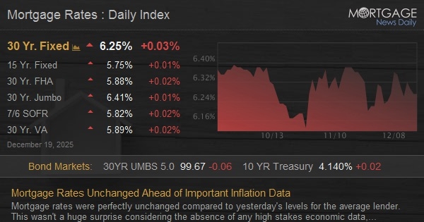 Mortgage rates were perfectly unchanged compared to yesterday's levels for the average lender. This wasn't a huge surprise considering the absence of any high stakes economic data, but tomorrow could be a different story.