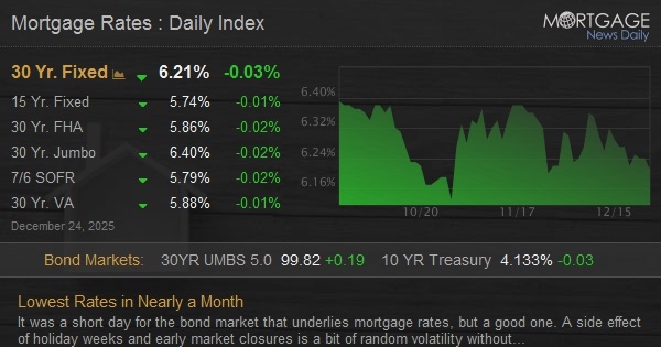 It was a short day for the bond market that underlies mortgage rates, but a good one. A side effect of holiday weeks and early market closures is a bit of random volatility without any obvious justification. When volume and participation are low, bonds can move a bit more than they otherwise might.